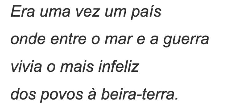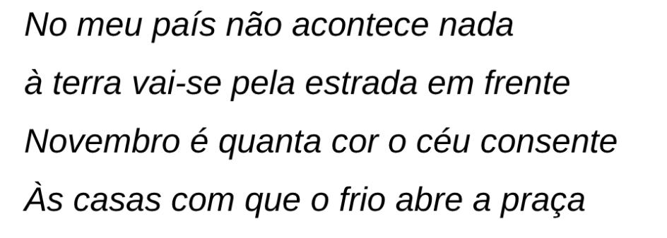 Nesse tão Belo quanto desencantado poema que igualmente denuncia a censura e a ausência de liberdade - “a boca é pra comer e pra trazer fechada” –, Portugal surge como um lugar alienado, sem informação, tristonho e fechado a sete chaves: