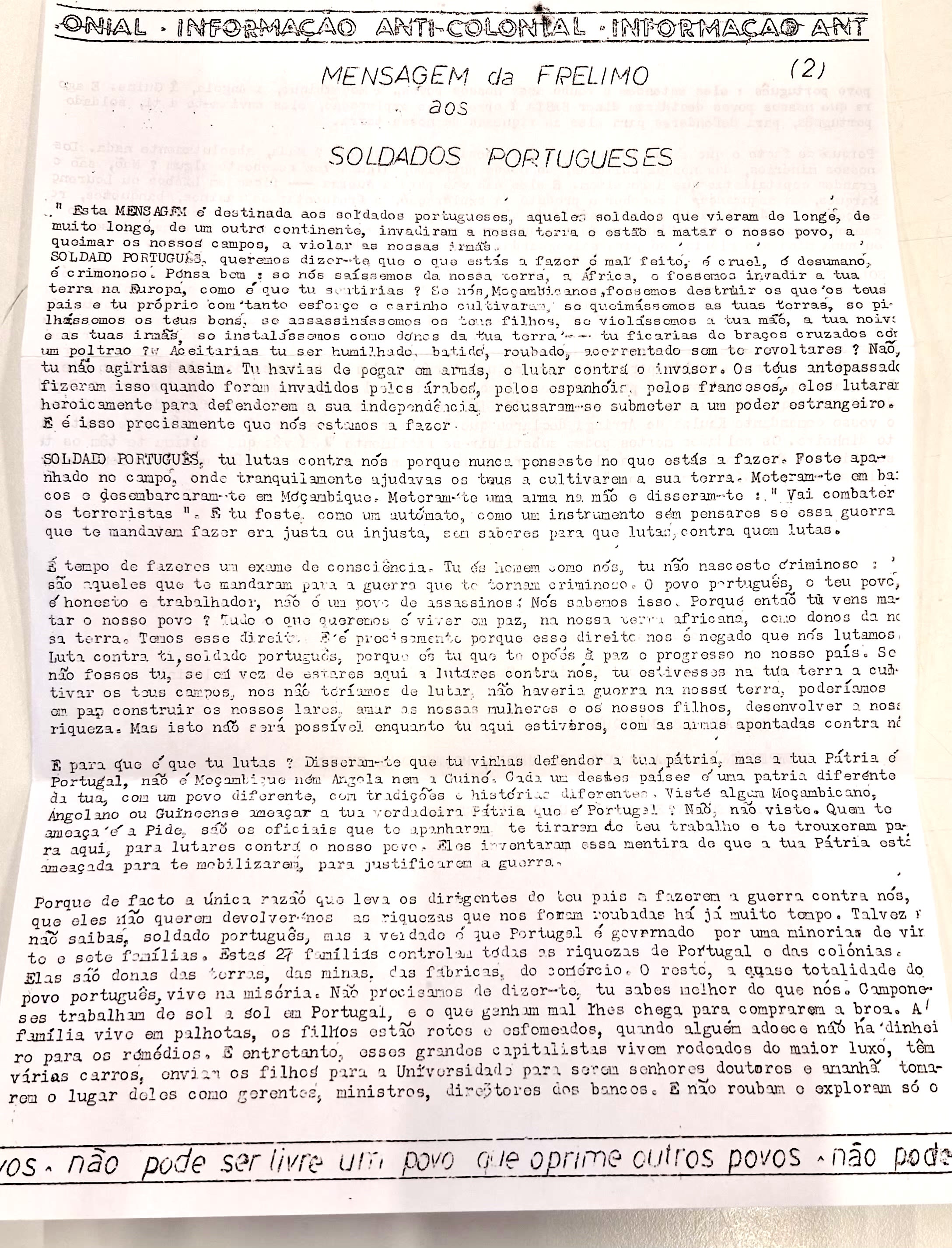 Esse olhar de esperança nos militares que haviam derrubado a ditadura, apesar de ainda manterem a guerra em África, suscitava, no entanto, algum cuidado e insónias por parte de quem se opunha ao conflito ultramarino. Por isso, meses mais tarde, recruta já feita, num dia de setembro de 1974, na camarata da Polícia Aérea e no bar dos instruendos, em Tancos, eis que, misteriosamente, aparecem uns panfletos identificados como sendo uma mensagem da FRELIMO (Frente de Libertação de Moçambique) aos soldados portugueses.