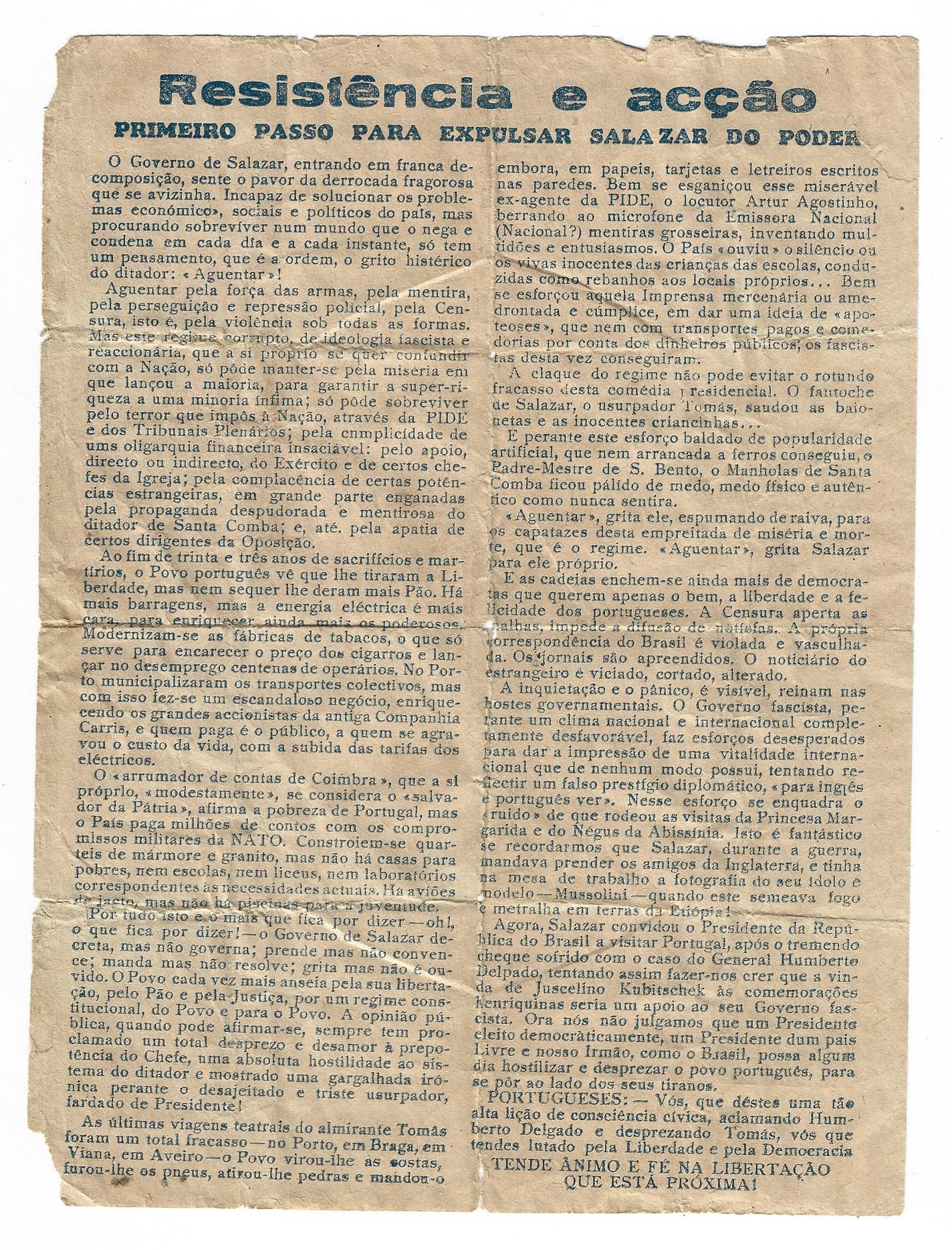 Fotografias em galeria (da esquerda para a direita): Ficha da PIDE de Cristina Pinto, Ficha da PIDE de Vasco Paiva, Ficha da PIDE de Jorge Seabra, Comunicado em favor da resistência anti-salazarista (Arquivo Daniel Balbino), Embarque de contigente militar para Moçambique (Fotografi de Fernando Mariano Cardeira), Grupo de soldados portugueses durante a guerra em Angola (Fotografia de José Simões)