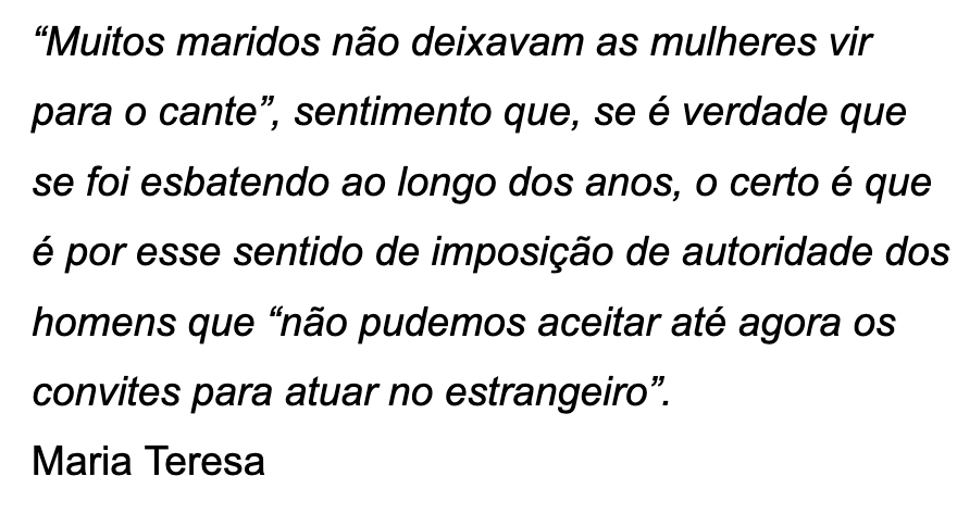 Insiste, aliás, em salientar que, inicialmente, “muitos maridos não deixavam as mulheres vir para o cante”, sentimento que, se é verdade que se foi esbatendo ao longo dos anos, o certo é que é por esse sentido de imposição de autoridade dos homens que “não pudemos aceitar até agora os convites para atuar no estrangeiro. Os maridos não permitem”, assegura Maria Teresa, perante o gesto de concordância das outras duas amigas e colegas de grupo.