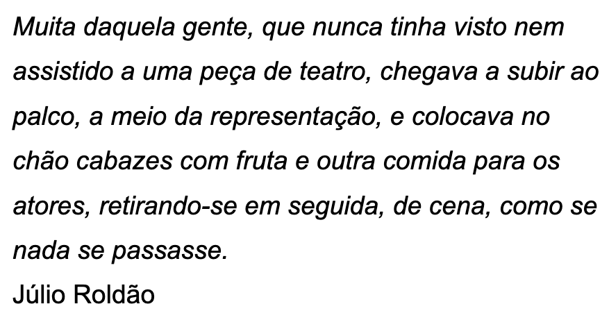 A novidade era tão grande, diz ainda Roldão, que “muita daquela gente, que nunca tinha visto nem assistido a uma peça de teatro, chegava a subir ao palco, a meio da representação, e colocava no chão cabazes com fruta e outra comida para os atores, retirando-se em seguida, de cena, como se nada se passasse. Era emocionante e nunca algum de nós tinha visto uma coisa assim”.